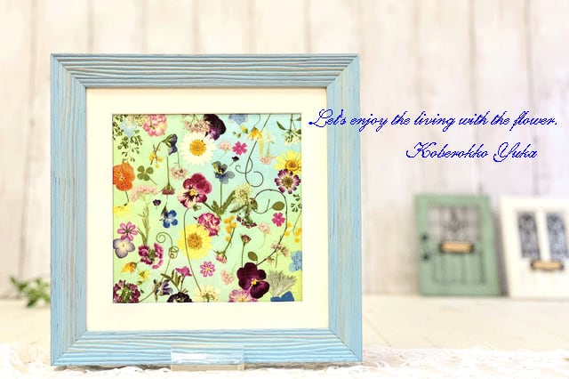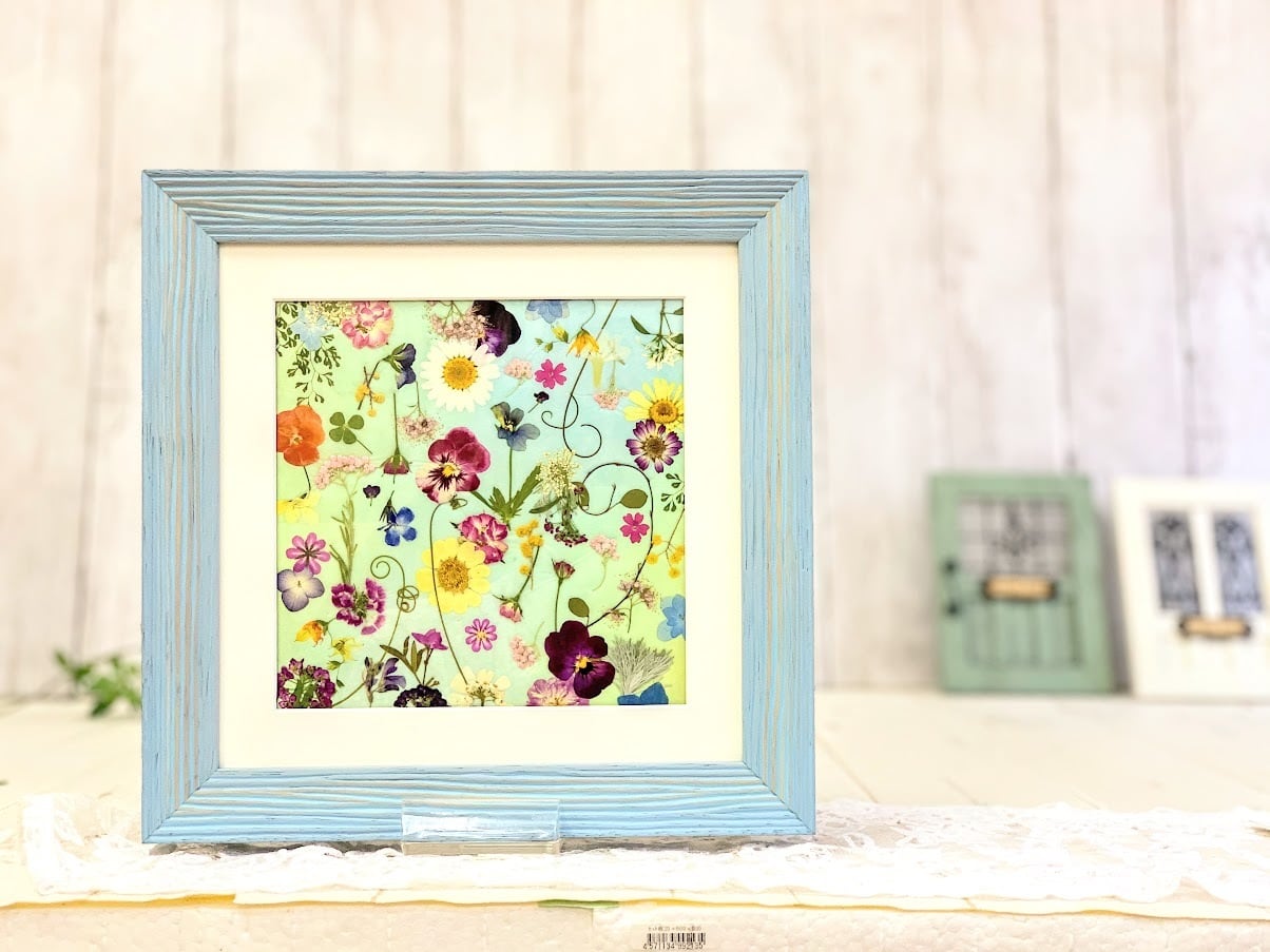 木製の水色フレームの中には、淡いパステル調の和紙をバックにたくさんの押し花が表情豊かにデザインされています。