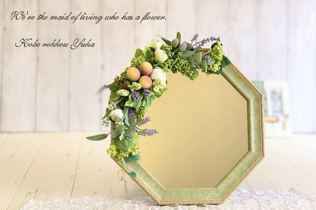 アンティークグリーンにたくさんの実り多いとされている実のアートフラワーがデザインされています。