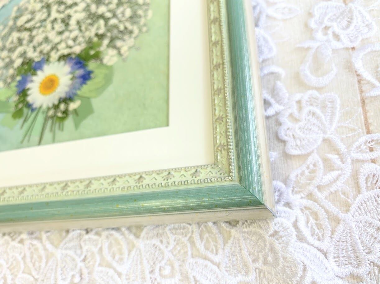淡いアンティークピンクのフレームに可愛らしく押し花がデザインされたとてもキュートな押し花額です。
