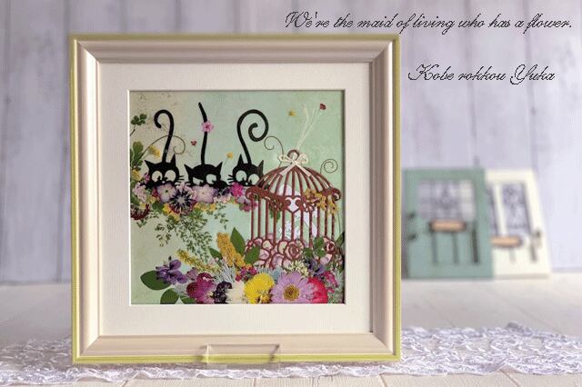 淡いパールホワイトとグリーンの額に可憐で小さな押し花と黒ネコさんがおしゃまにデザインされたインテリアアートです。