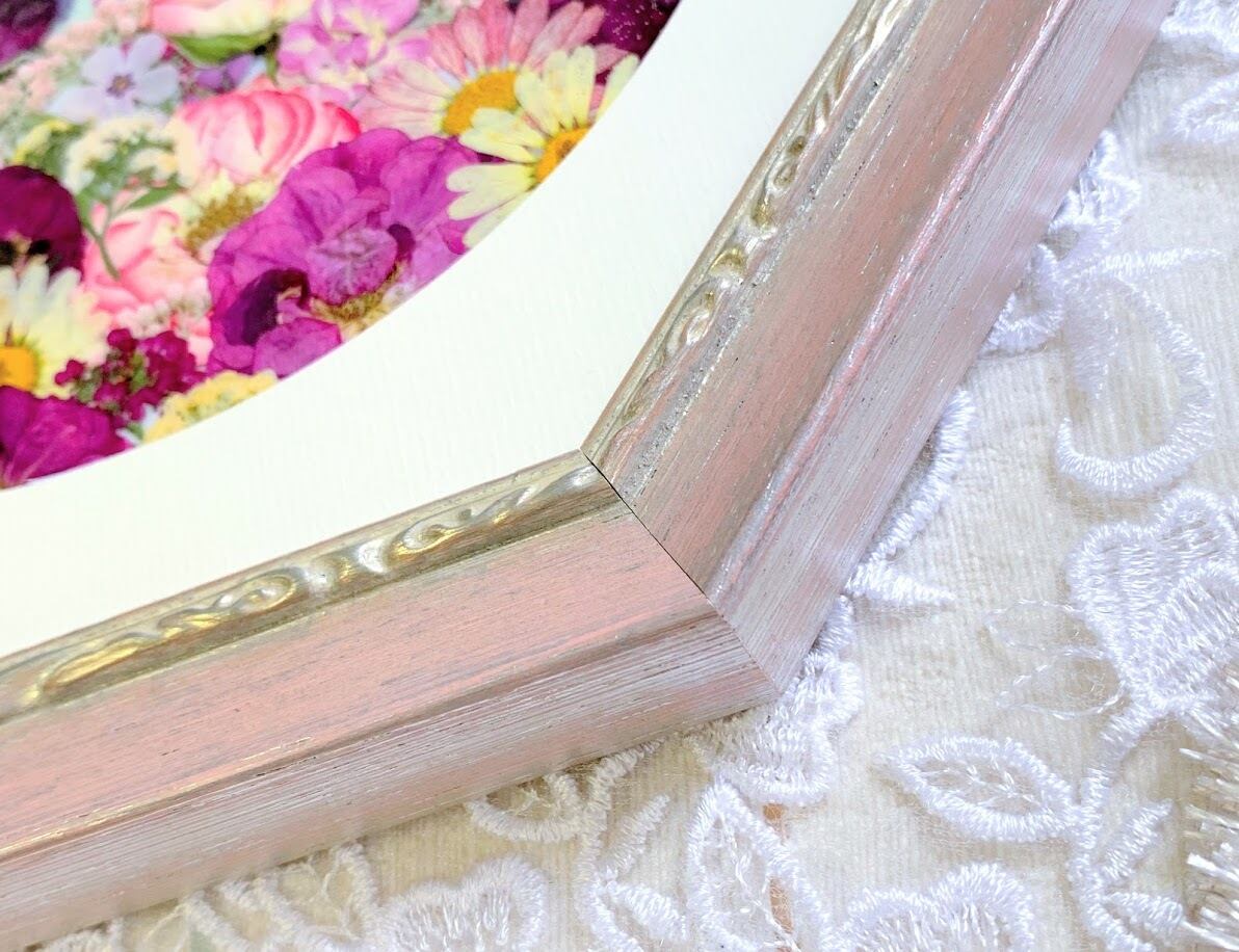 淡いピンクの色調ですが、額縁の側面が銀色になっており、アンティークな雰囲気も感じられます。