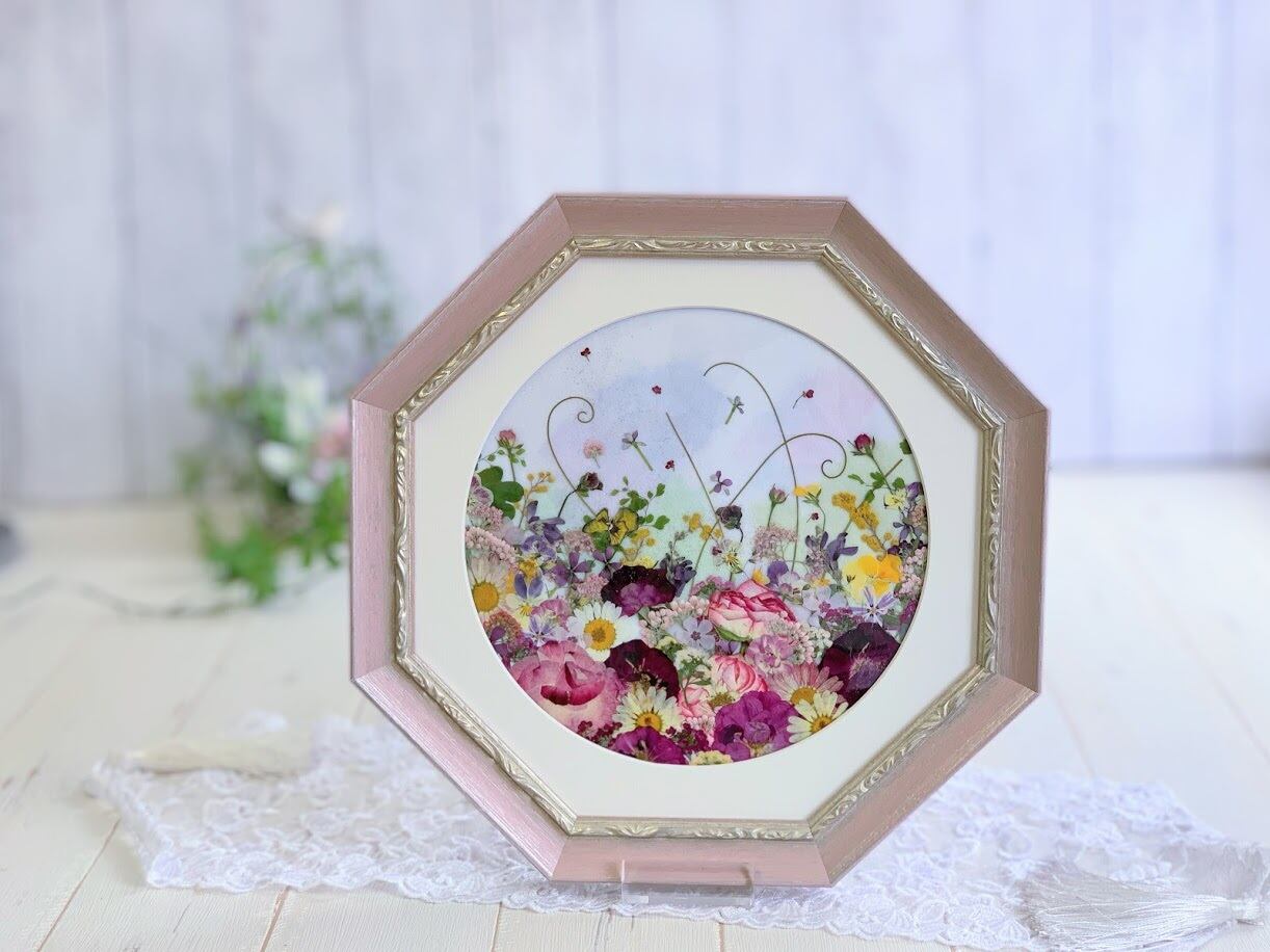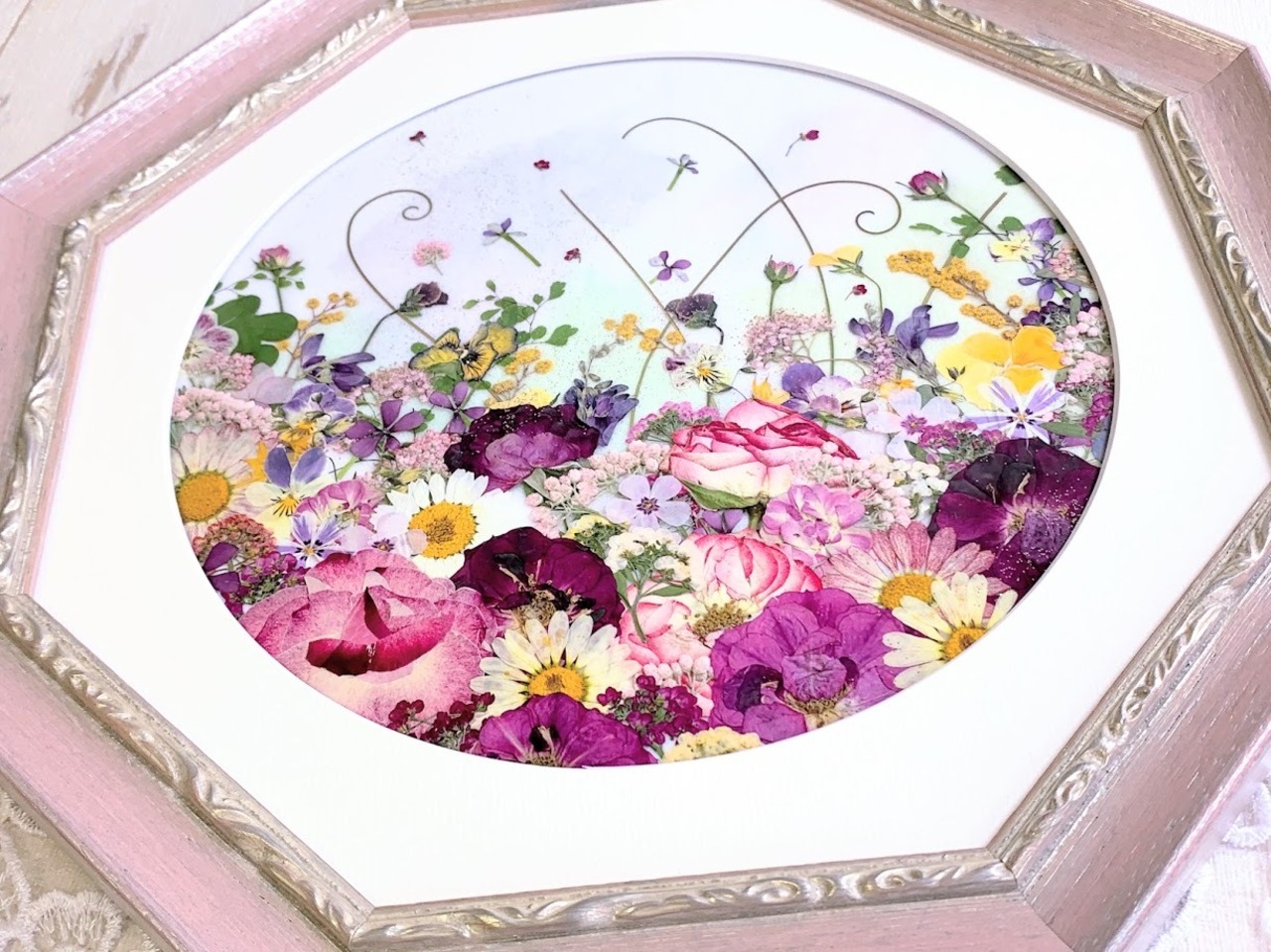 空に舞う淡いピンクの幸せ呼ぶ八角押し花アート 押し花額