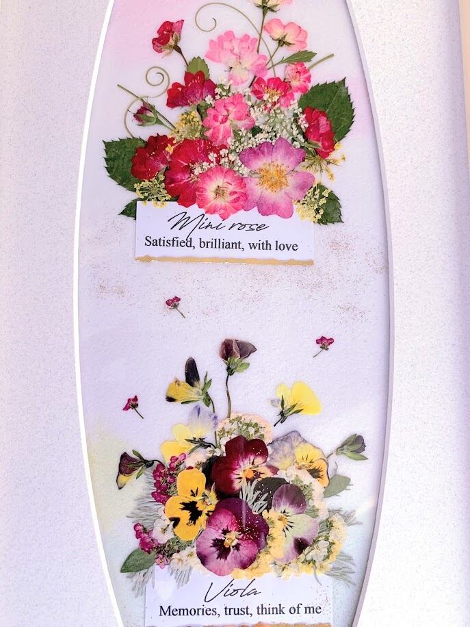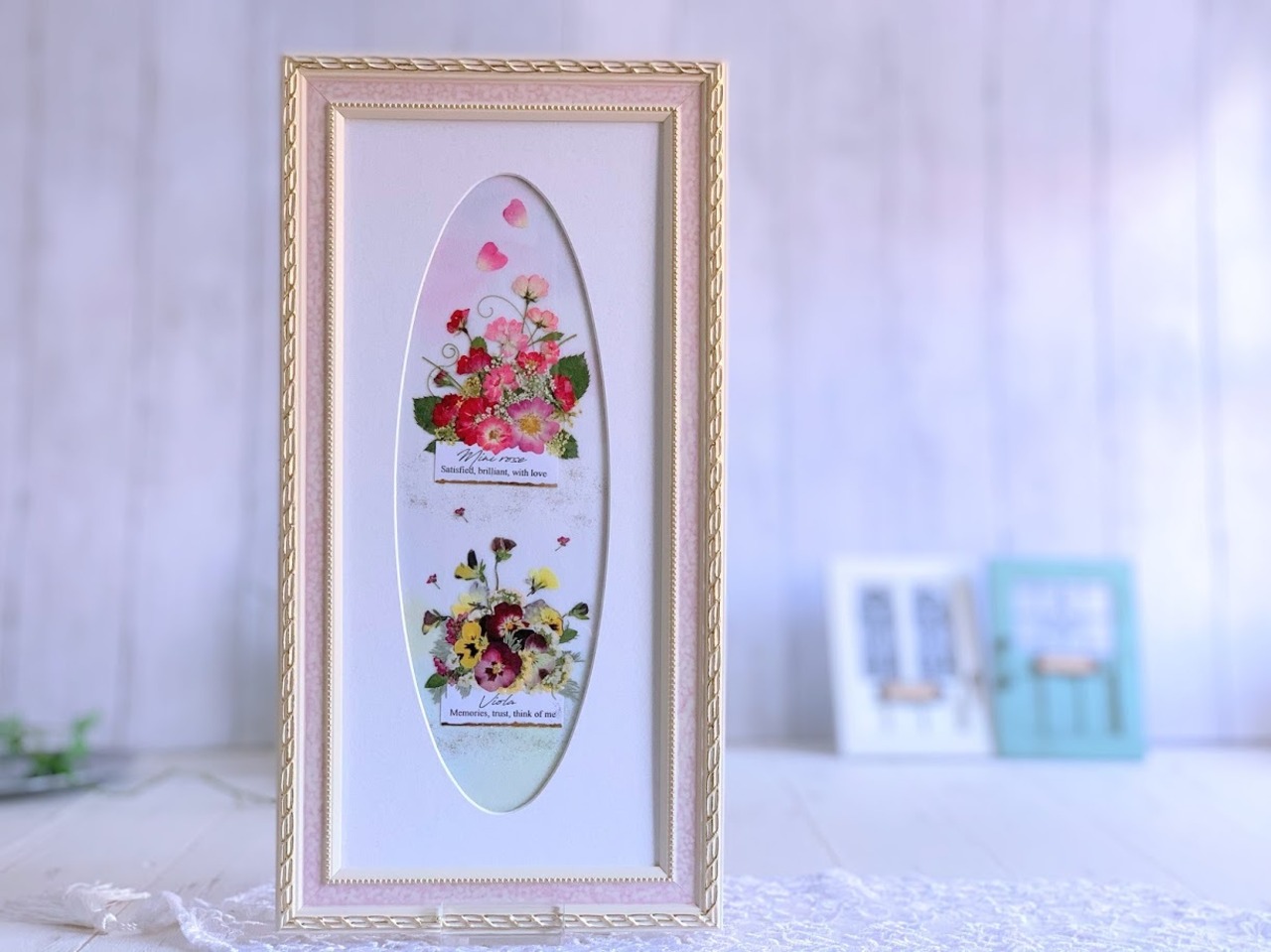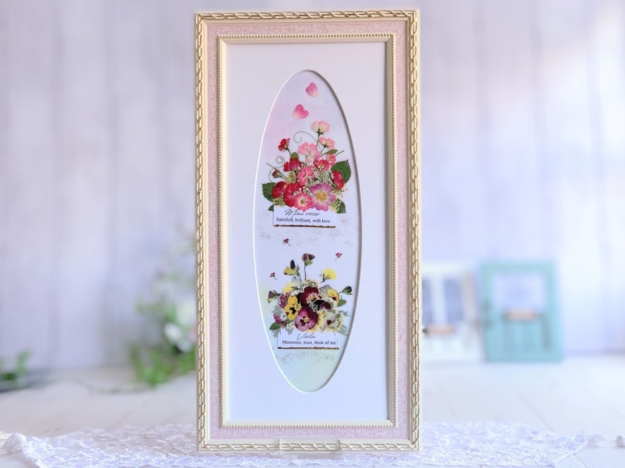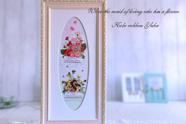 淡いピンクのかわいいフレームの中に小さなミニバラとビオラをデザインしました。
