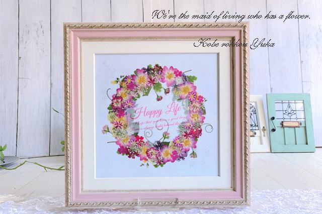 ミニバラを中心にたくさんの小さな押し花をリースの形にデザインしたインテリアアートです。