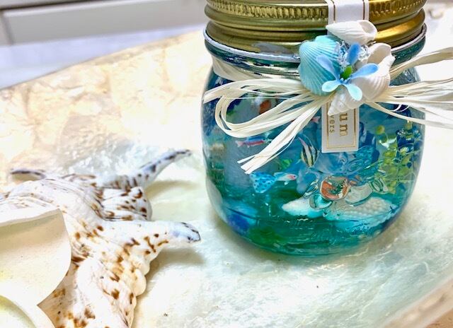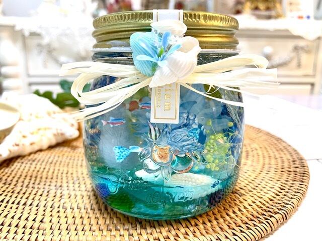 涼し気なラフィアと小さな貝殻でかざられ、プレゼントにもぴったりです。
