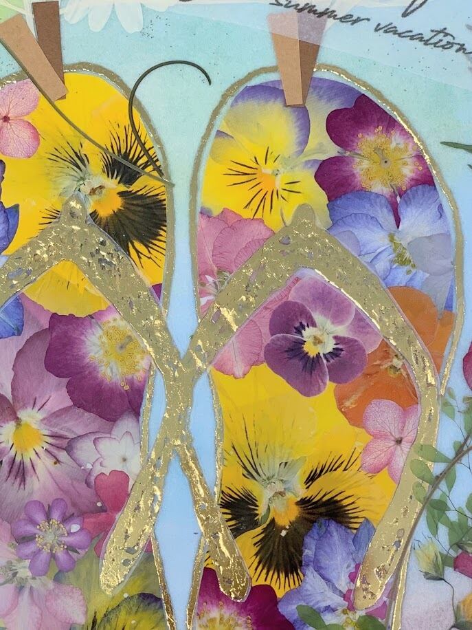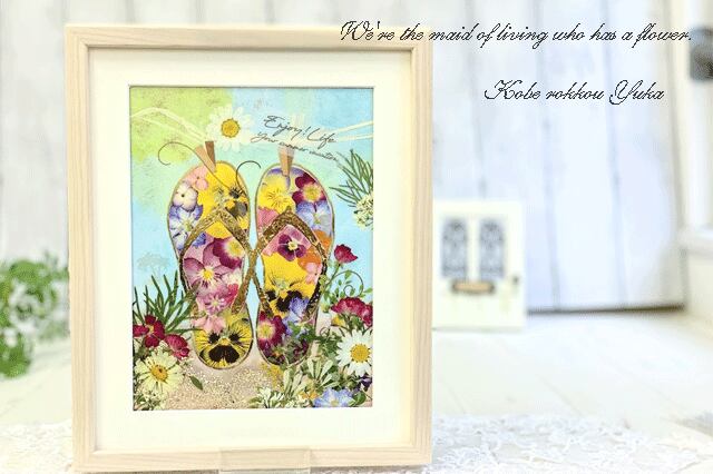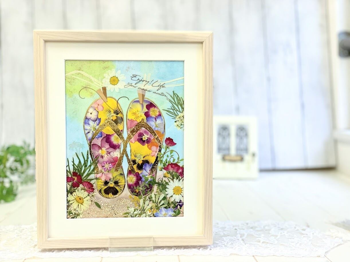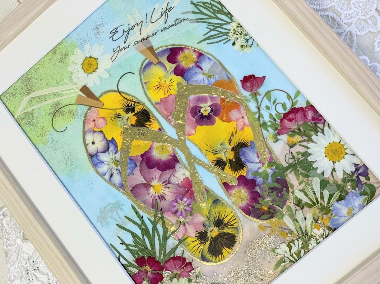 トロピカルカラーの明るいお色のたくさんの押し花で作られたビーチサンダル、
