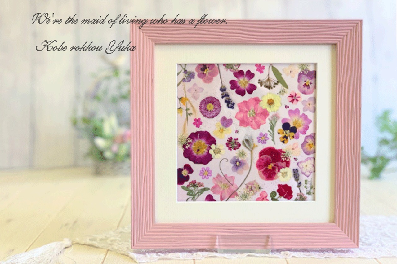 色々な種類のピンク系の押し花が表情豊かにデザインされています。