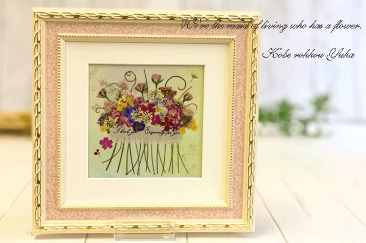 淡いピンクのフレームに可愛らしく押し花がデザインされたとてもキュートな押し花額です。