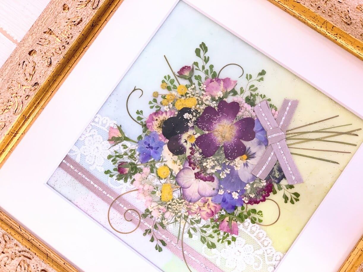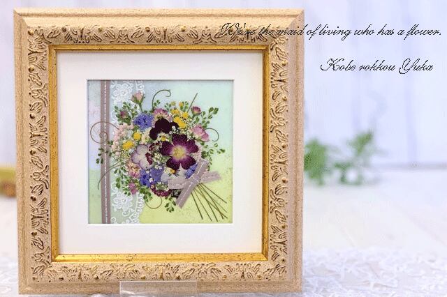 アンティークゴールド華やかな額に可憐で小さな押し花がおしゃれにデザインされたインテリアアートです。
