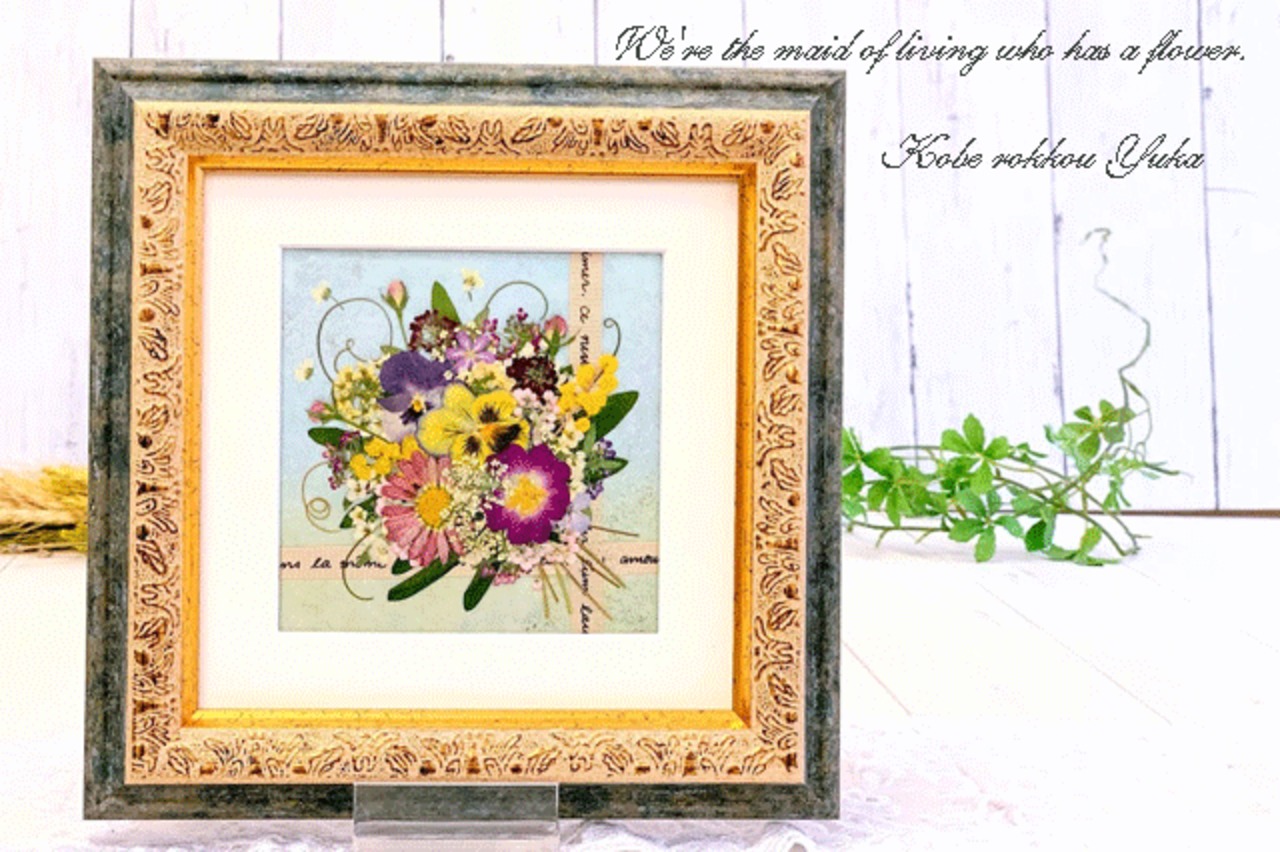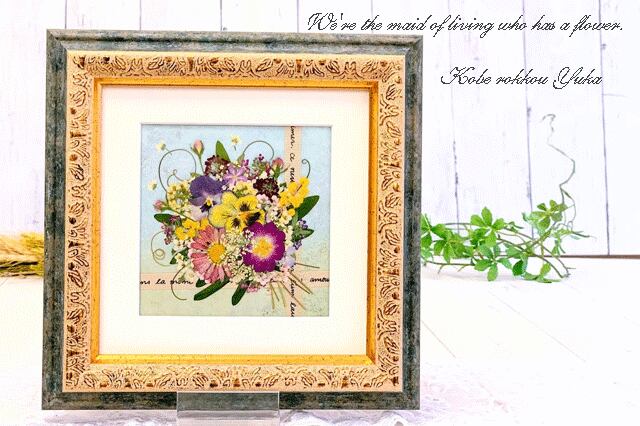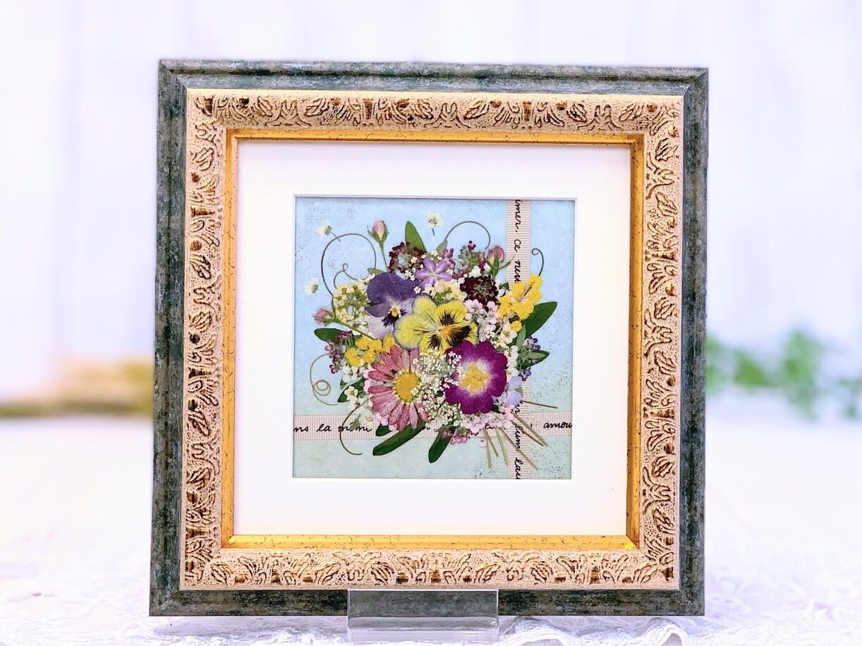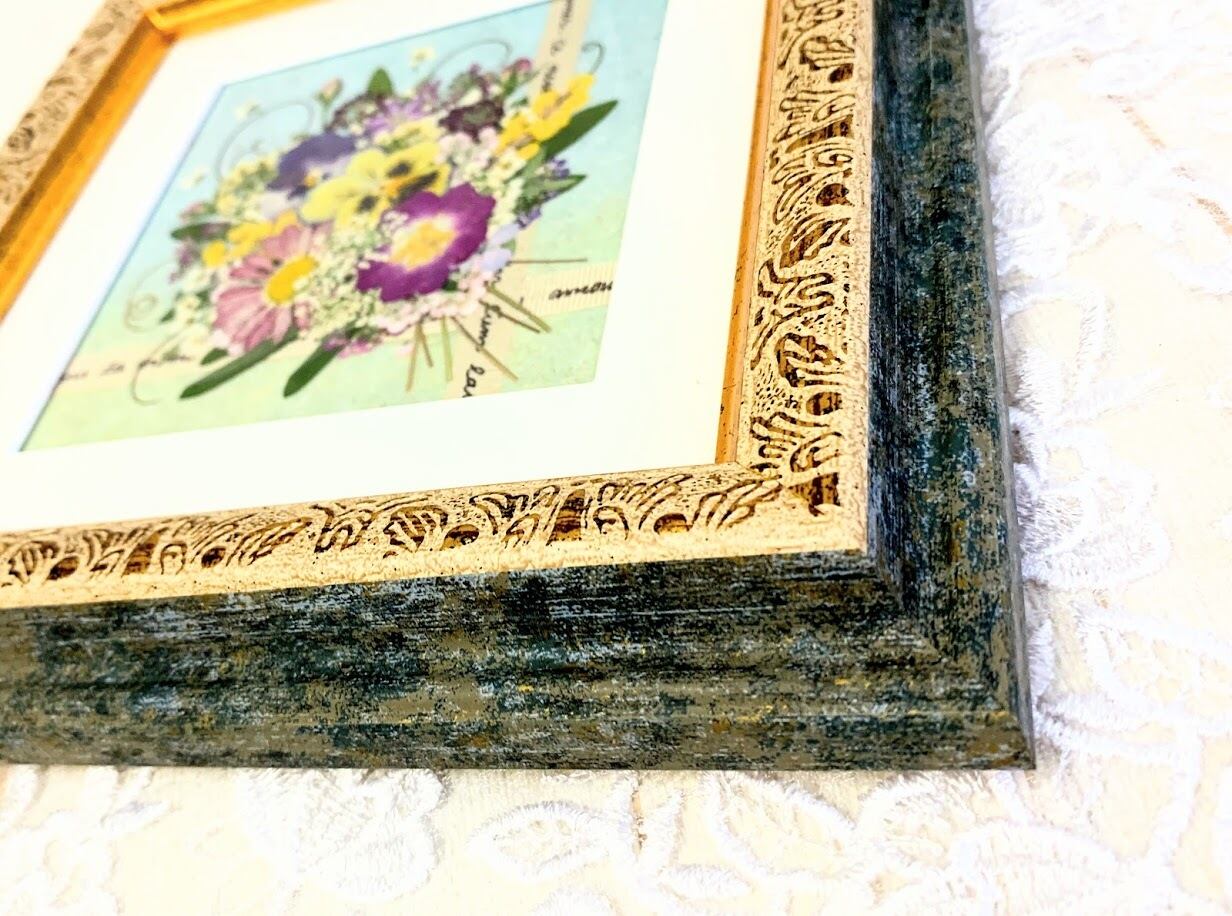 深い緑とゴールドの重厚なフレームに押し花がとても上品な押し花額です。