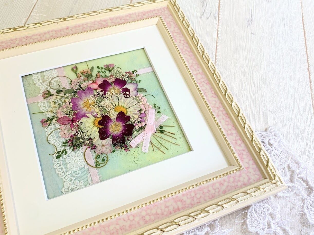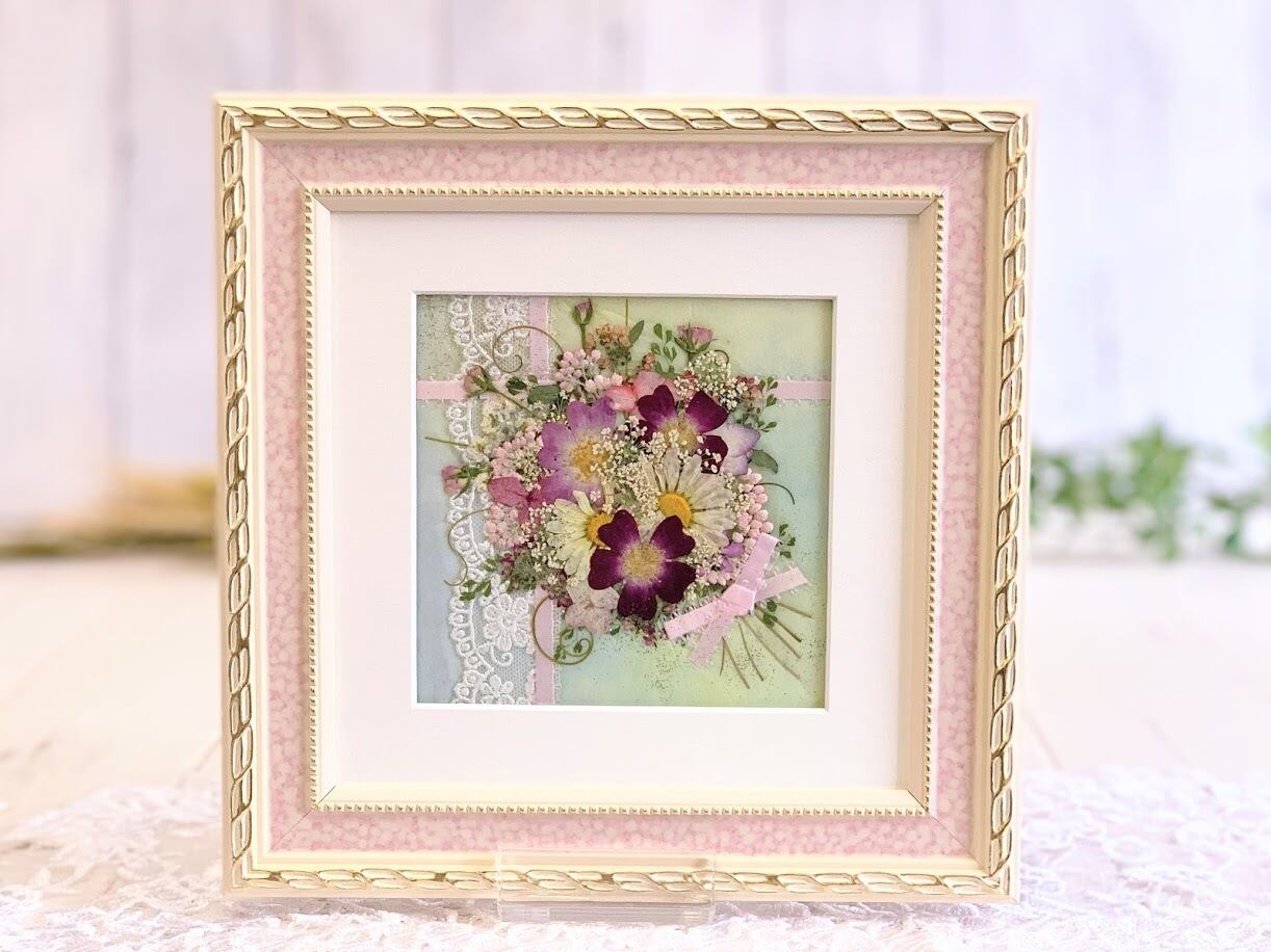 淡いピンクのフレームに可愛らしく押し花がデザインされたとてもキュートな押し花額です。