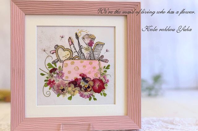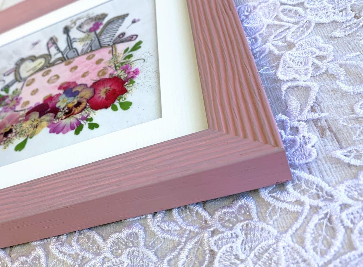 木製の淡いピンクフレームにお洒落なコスメのポーチが押し花でデザインされています。