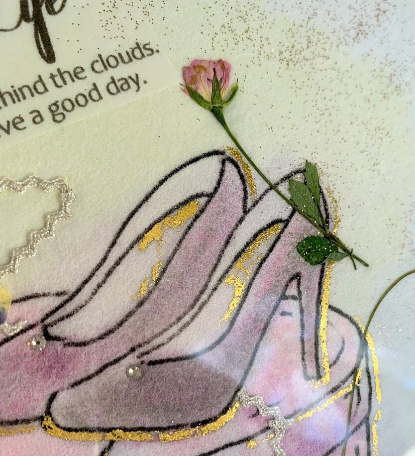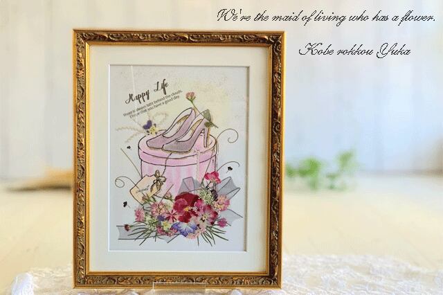 アンティークゴールドのフレームにかわいい押し花とスタイリッシュなハイヒールとBOXがデザインされています。