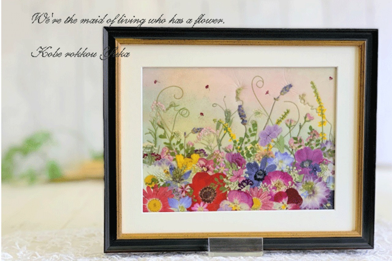 青い空に向かってたくさんのお花たちが伸びていく押し花インテリアアート額です。