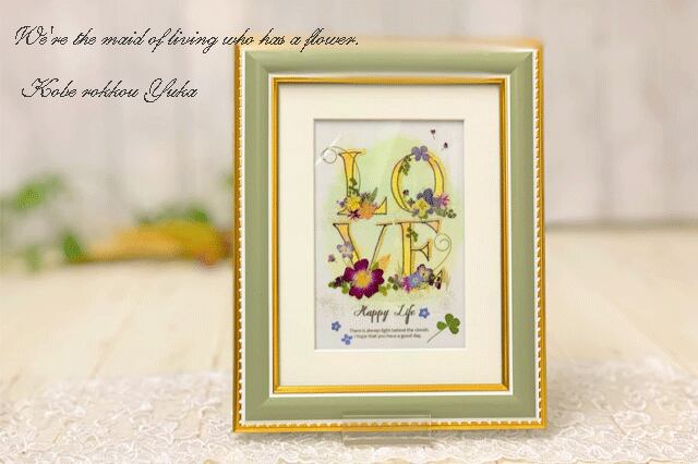 「ラブ」の文字をお花で飾ったアート押し花額 ミニサイズ