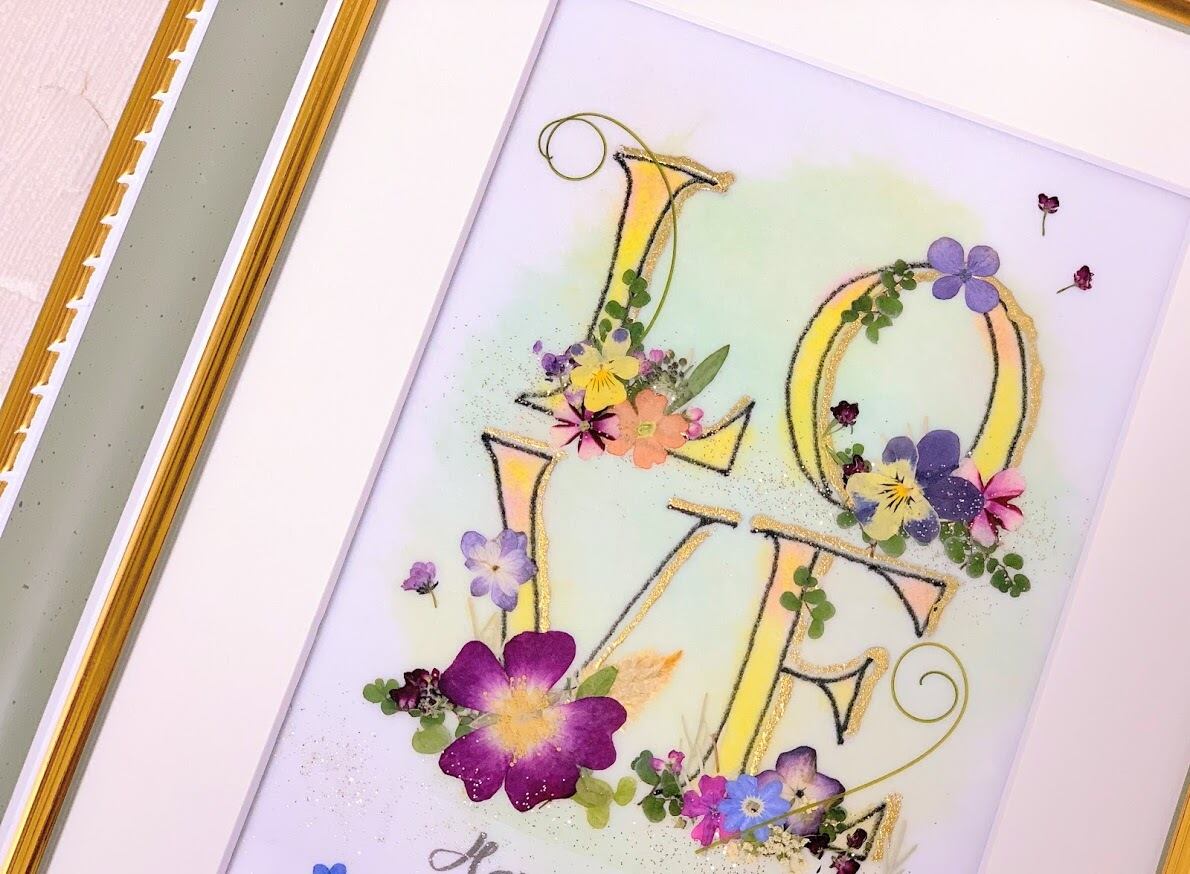 「LOVE」の文字を可愛い押し花で華麗に飾った押し花アート額です。