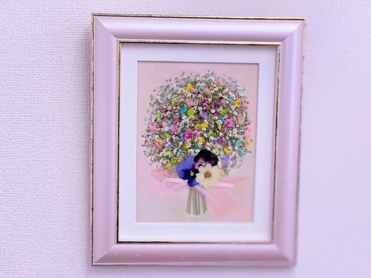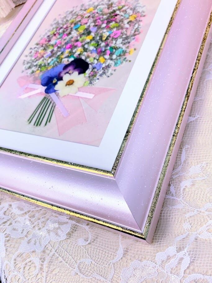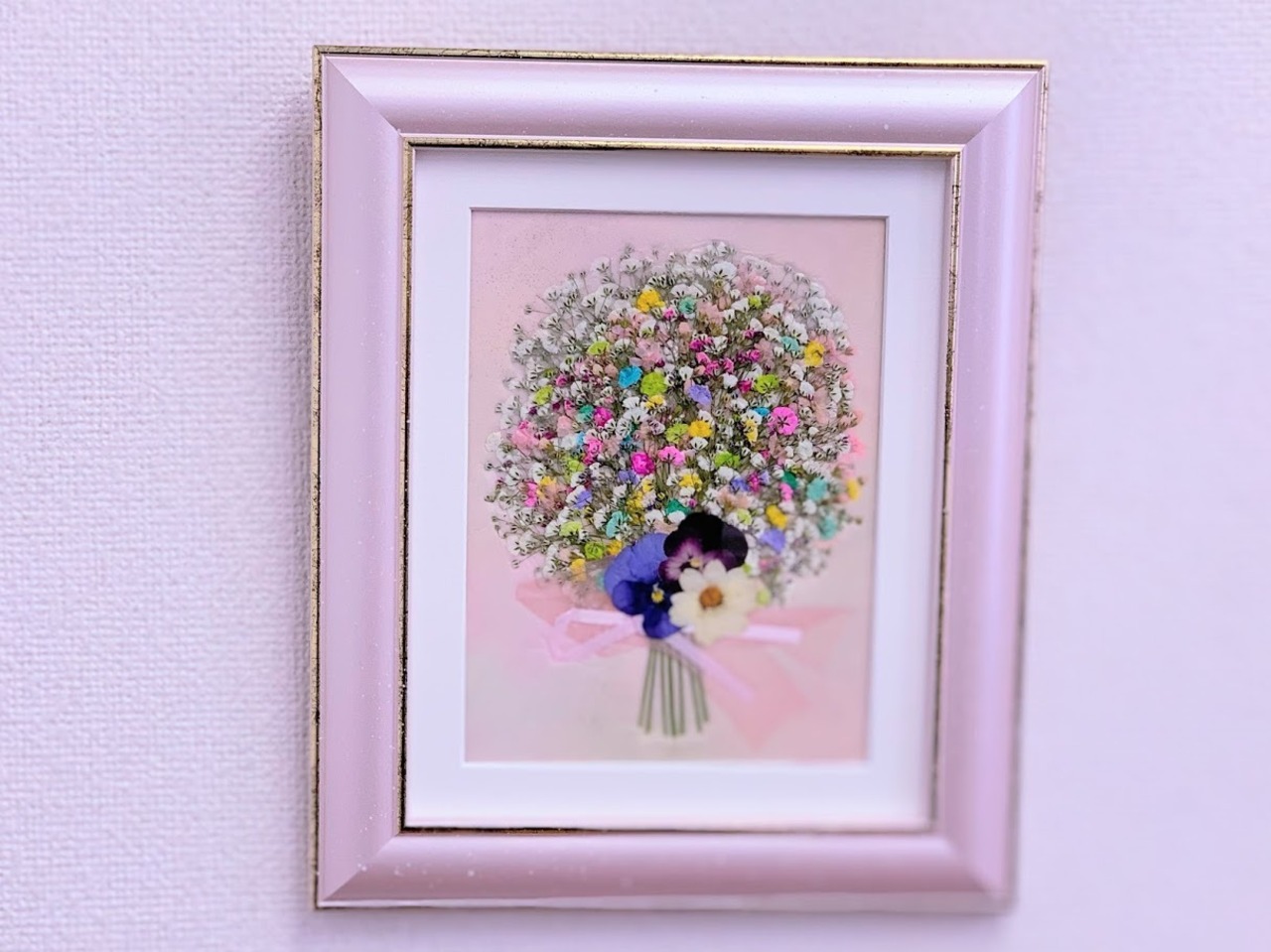 虹色 夢色 かすみ草の押し花アート額 淡いピンクタイプ 押し花額