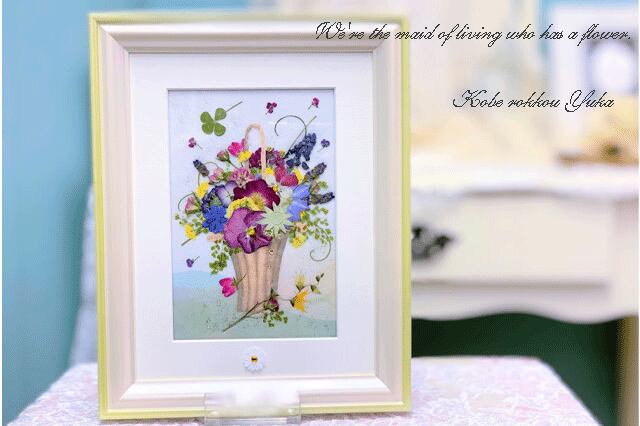 淡いブル―系の台紙と淡い緑フレームがとてもおしゃれな押し花額です。