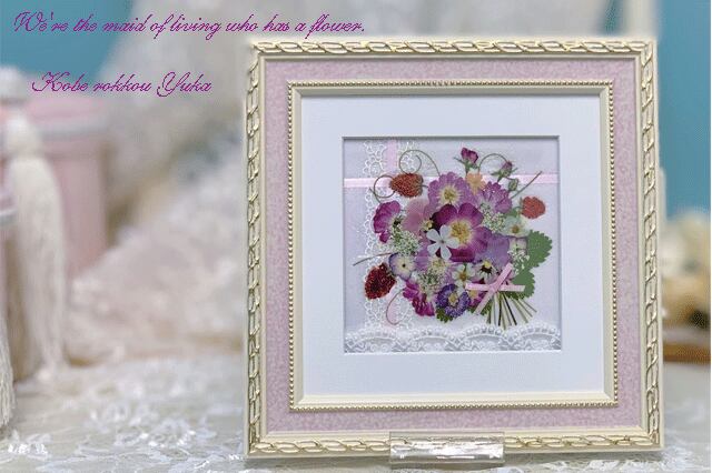 ミニミニイチゴも入ったとても甘い雰囲気の押し花アートフレームです。
